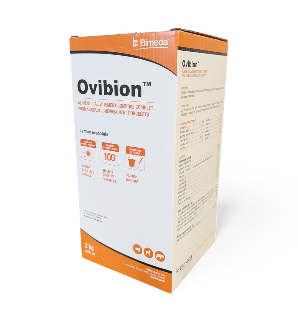Ovibion est un aliment d'allaitement composé complet spécifiquement formulé pour les agneaux, les chevreaux de boucherie, les chevrettes d'élevage et les porcelets. Solution idéale en remplacement du lait maternel, il garantit la vitalité des jeunes animaux tout en offrant une sécurité digestive renforcée dès la phase néonatale.