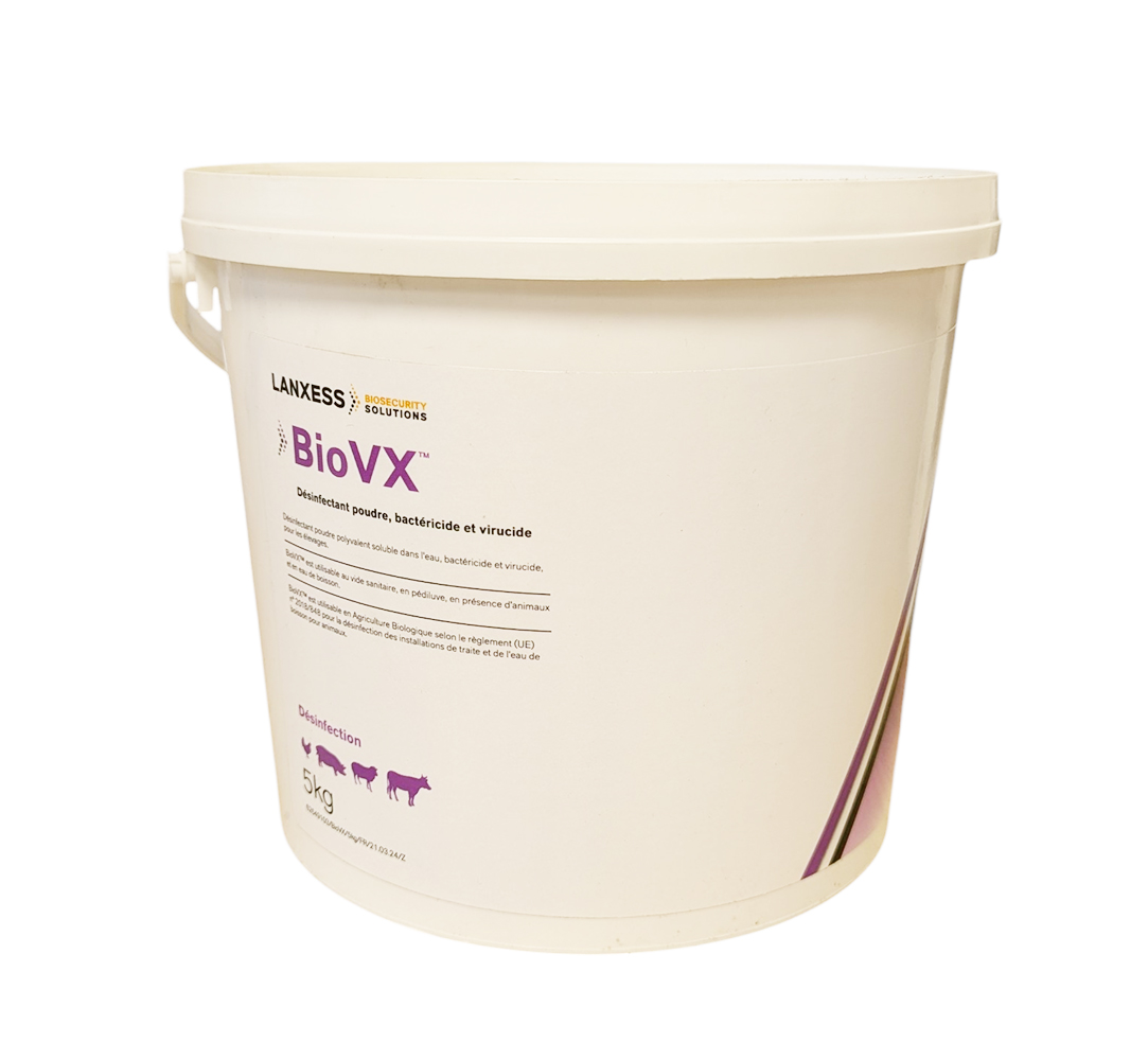 Le BioVX™ est un désinfectant de routine ultra-performant en poudre, certifié virucide et bactéricide pour les environnements agricoles. Polyvalent, il assure la biosécurité des surfaces, du matériel, des véhicules, des pédiluves et peut même être utilisé pour le traitement de l'eau de boisson animale. Sa formule est compatible avec l'Agriculture Biologique pour la désinfection du matériel de traite et de l'eau de boisson.