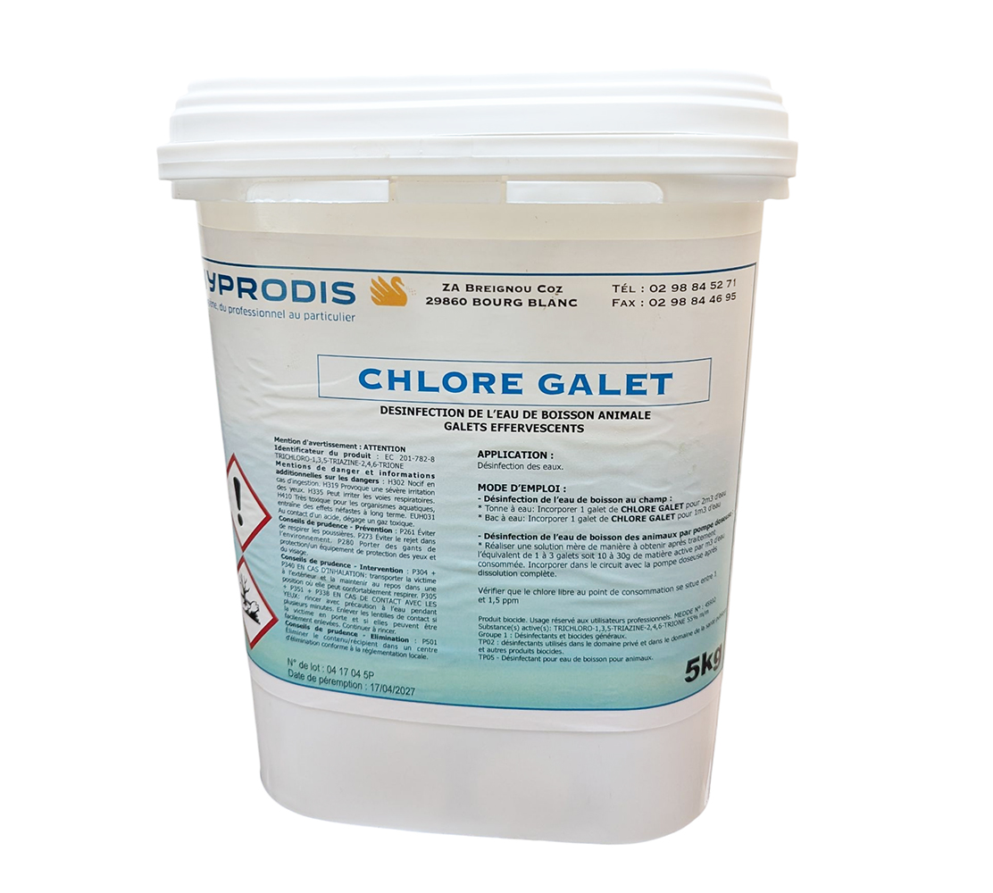 Le Chlore Galet en seau de 5 kg est un traitement effervescent spécifiquement conçu pour la potabilisation de l'eau de boisson animale. Grâce à ses propriétés bactéricides, virucides et fongicides, il neutralise le biofilm et garantit une hygiène irréprochable dans les tonnes à eau, les bacs de récupération et les circuits de distribution.