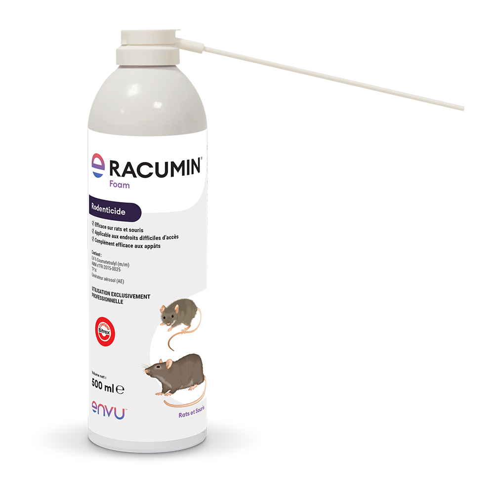 Racumin Foam est une mousse rodenticide biocide TP14, formulée à base de coumatétralyl (anticoagulant 1re génération). Elle agit par contact et ingestion lorsque les rongeurs se frottent contre les zones traitées et ingèrent la mousse lors du toilettage. Produit réservé aux professionnels titulaires du Certibiocide.