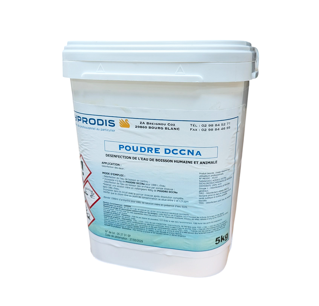 La Poudre DCCNA est un désinfectant soluble haute performance conçu pour rendre l'eau de boisson, humaine et animale, parfaitement potable. Grâce à son spectre d'action ultra-large (bactéricide, virucide, fongicide, sporicide et algicide), elle assure une sécurité sanitaire totale dans les bacs, tonnes à eau et circuits de distribution.