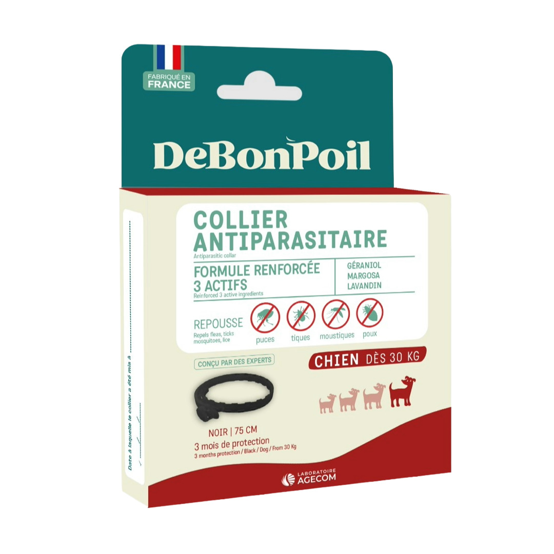 Les grands chiens, souvent amateurs de balades en forêt ou de grands espaces, sont des cibles privilégiées pour les parasites. Le collier DeBonPoil (Laboratoire Agecom) offre une barrière protectrice continue adaptée à leur gabarit.