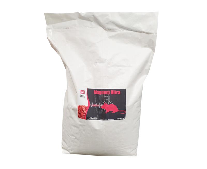 Le MAGNUM ULTRA est un rodenticide professionnel de haute performance formulé sur un support d'avoine décortiquée particulièrement appétent. À base de Brodifacoum (0,005%), l'anticoagulant le plus puissant du marché, il permet de lutter efficacement contre les populations de rats et de souris, même les plus résistantes. Ce conditionnement en sac de 10 kg est idéal pour les interventions de grande envergure dans les bâtiments privés, publics ou agricoles.