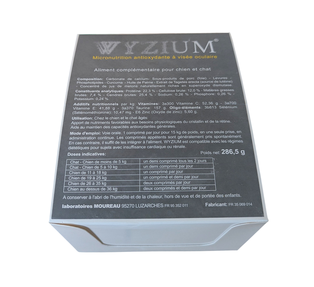 Le WYZIUM 300 cps est un aliment complémentaire grand format conçu pour le soutien oculaire des chiens et des chats. Grâce à un complexe unique de micronutriments antioxydants, il contribue à retarder l'opacification du cristallin et à préserver les fonctions de la rétine. Ce format de 300 comprimés est idéal pour les traitements de fond en administration continue.