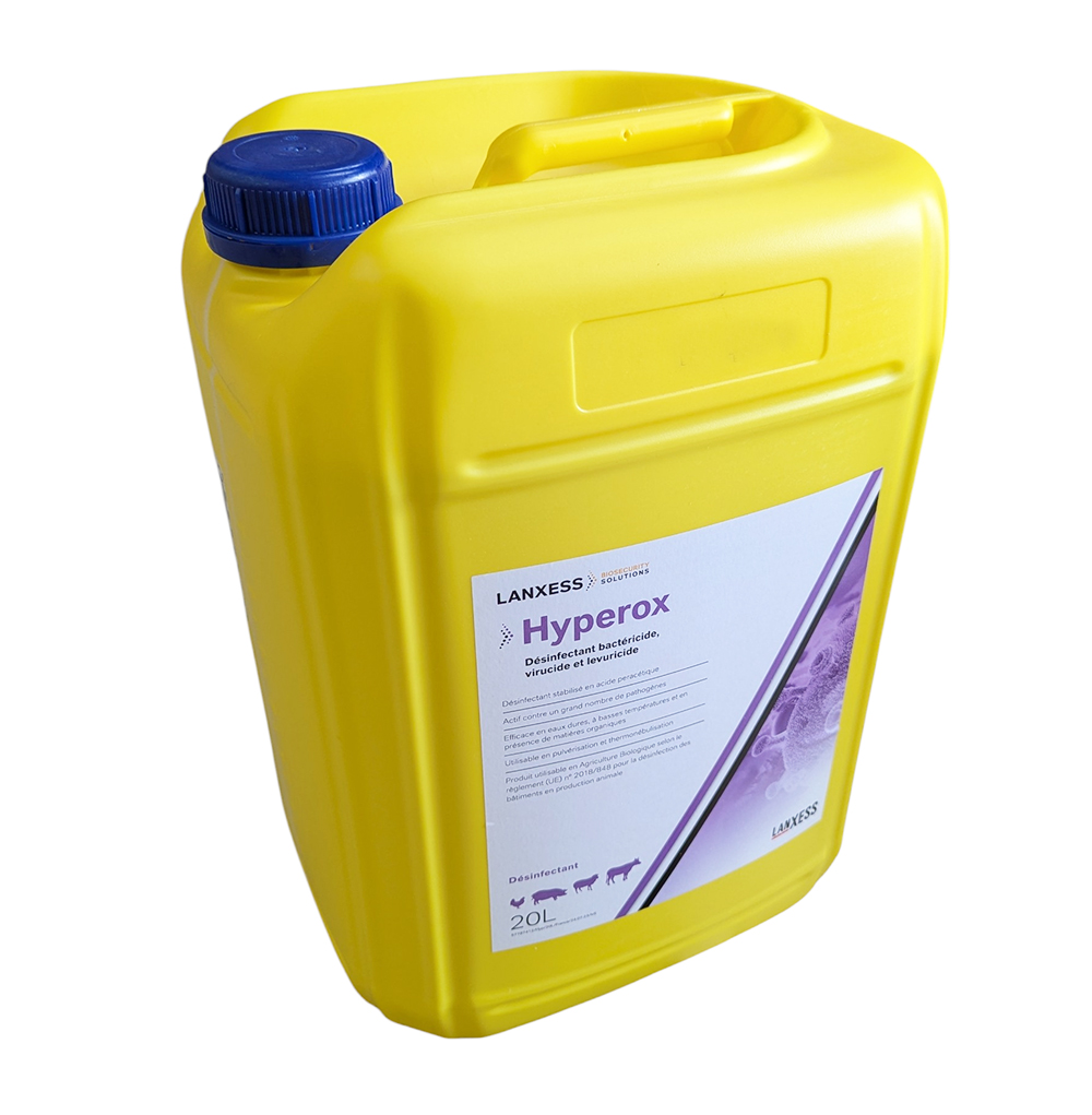 Hyperox™ est un désinfectant oxydant puissant à large spectre, formulé à base d'acide péracétique stabilisé. Spécifiquement conçu pour l'hygiène des bâtiments d'élevage, du matériel et des véhicules de transport, il garantit une élimination efficace des bactéries, champignons et virus, même à basses températures. Respectueux de l'environnement, il se dégrade sans laisser de résidus toxiques et est utilisable en Agriculture Biologique.