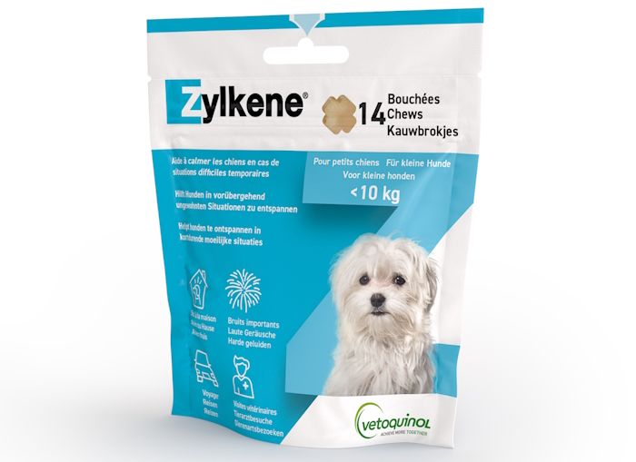 Zylkène Chews 75mg est un aliment complémentaire naturel pour chats et petits chiens qui aide à réduire le stress chronique et situationnel (feux d'artifice, orage, transport, etc.).