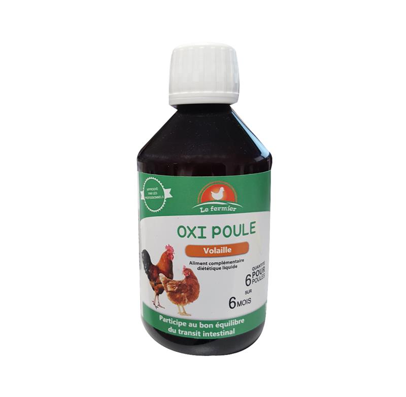 Le Fermier OXI POULE est un aliment complémentaire diététique liquide conçu pour toutes les volailles (poules, canards, dindes, oies). Sa formule experte participe activement au contrôle de la flore intestinale et à l'équilibre précieux du microbiote. Ce soin naturel garantit une consommation d'œufs sans risque, car il n'altère ni leur goût ni leur odeur pendant toute la durée du traitement.