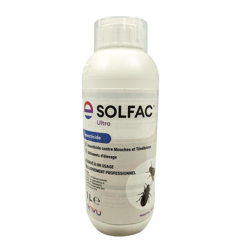 SOLFAC® Ultra est l'insecticide polyvalent de référence pour l'hygiène rurale et la protection des bâtiments d'élevage (bovins, porcins, volailles, équidés). Grâce à sa formule unique associant trois substances actives, il offre un excellent effet choc avec une mortalité de 100% constatée sur les mouches en 20 minutes et sur les ténébrions en 6 jours. Deux modes d'application : en spray résiduel ou en nébulisation (thermique ou ULV).