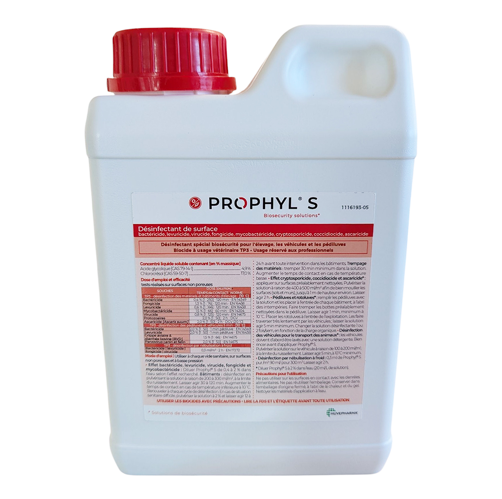PROPHYL® S est un biocide essentiel pour établir des barrières de biosécurité rigoureuses dans tous les types d'élevages. Ce désinfectant à large spectre est particulièrement reconnu pour son efficacité contre les agents responsables des diarrhées néonatales, notamment à une concentration de 2% sur les oocystes de Cryptosporidium parvum et Eimeria spp. Sa formule avancée reste active même en présence de matières organiques.
