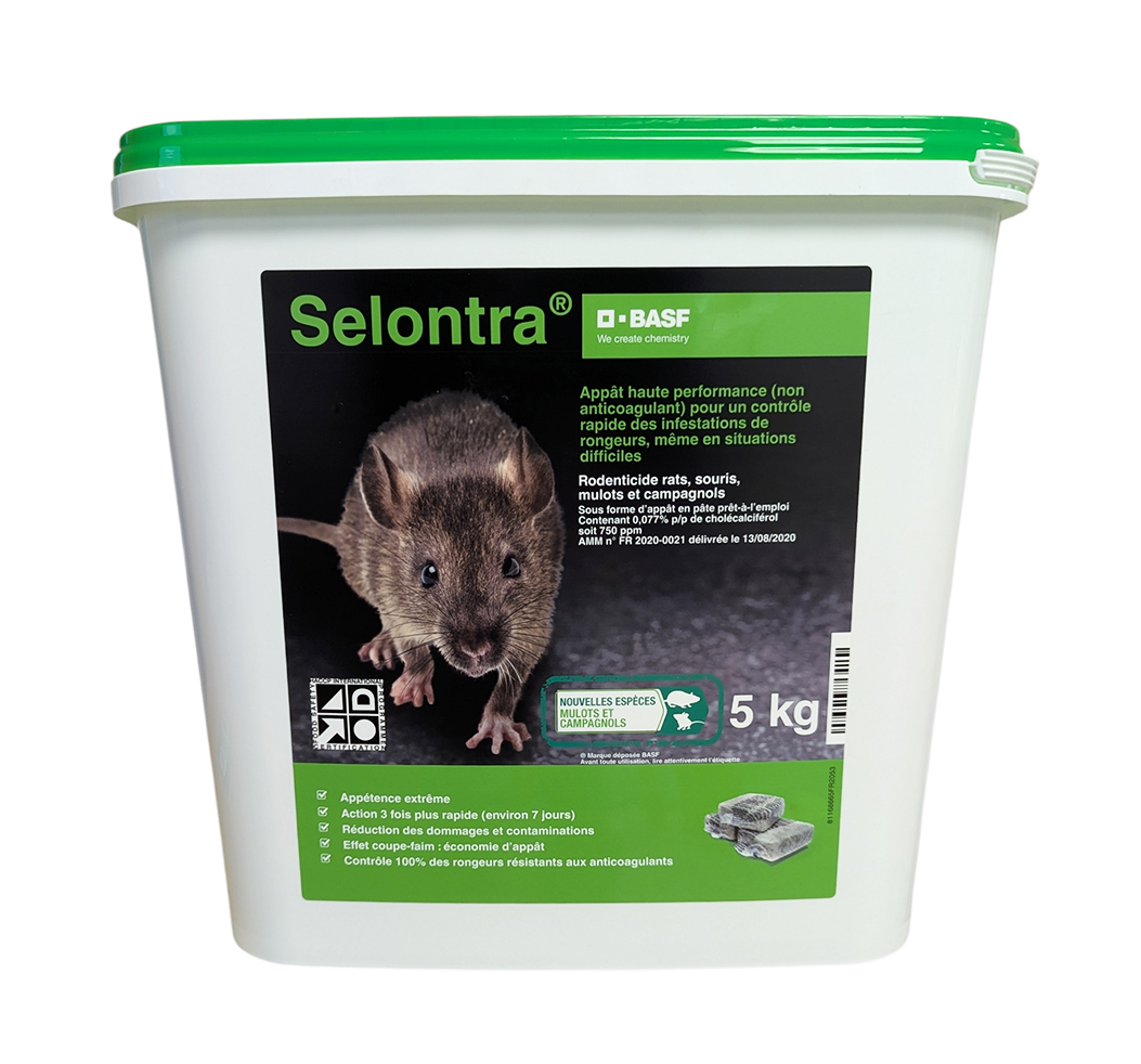 Est-il efficace contre les campagnols ? Oui, Selontra est spécifiquement indiqué pour la lutte contre le campagnol des champs et le mulot sylvestre, en plus des rats et souris classiques.