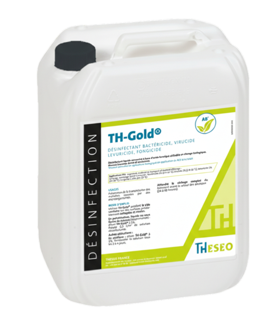 Le TH-GOLD est un désinfectant liquide concentré révolutionnaire à base d'acide formique, conçu pour l'hygiène rigoureuse des logements et matériels de transport d'élevage (TP3). Grâce à sa technologie de mousse brevetée, il garantit une couverture optimale des surfaces et une élimination radicale des agents pathogènes, tout en étant 100% biodégradable en 14 jours.