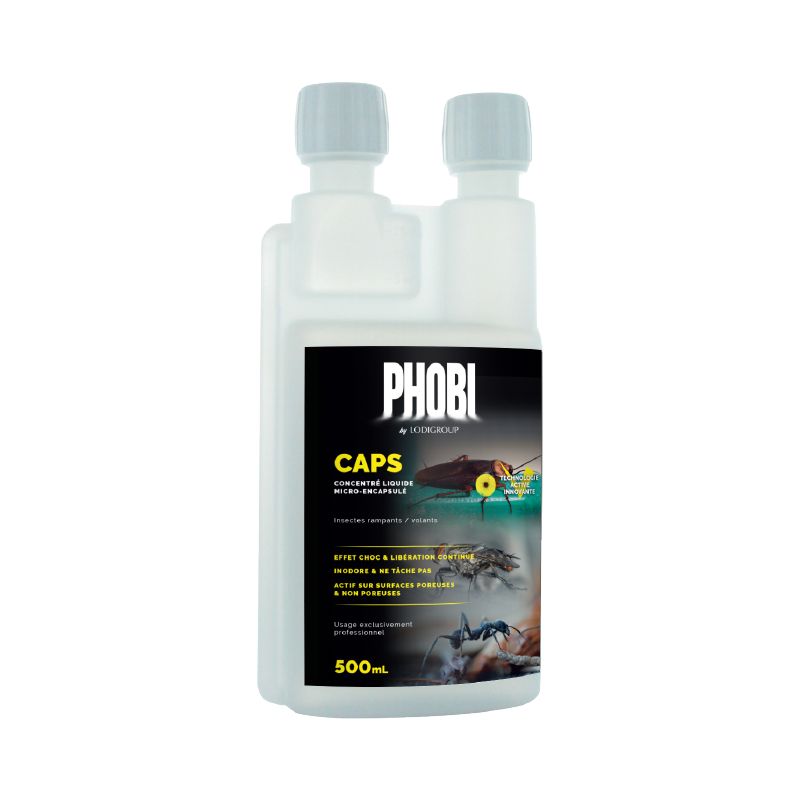 Le PHOBI CAPS est un insecticide liquide concentré à usage strictement professionnel, conçu pour la lutte contre une large gamme d'insectes rampants et volants. Grâce à sa technologie de micro-encapsulation active, il combine une action foudroyante immédiate avec une persistance d'action exceptionnelle pouvant atteindre 12 semaines sur tout type de support.