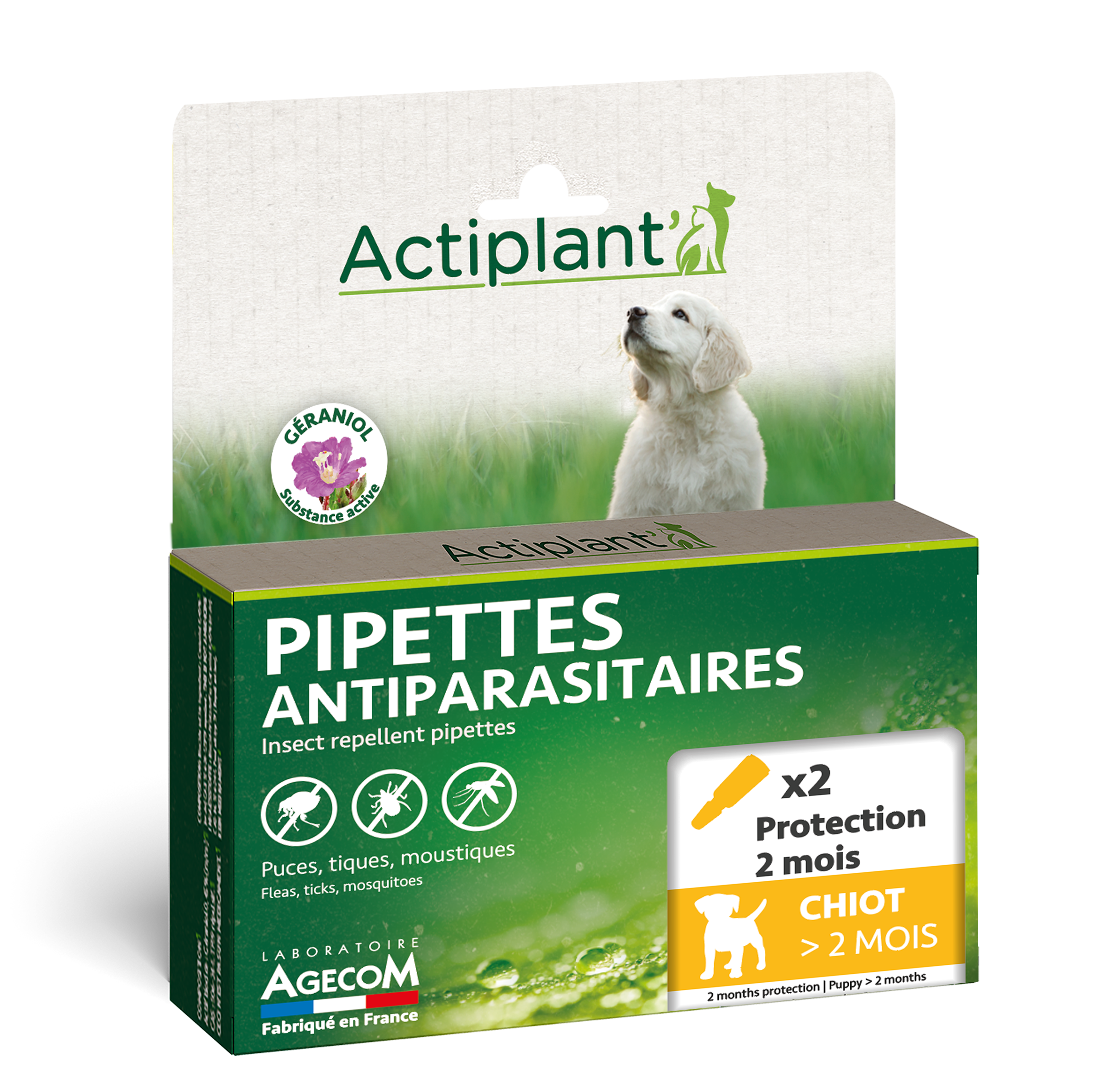 Protégez votre jeune compagnon sans agressivité chimique grâce aux Pipettes Actiplant' Chiot. Formulées à base de Géraniol (actif d'origine végétale), elles repoussent efficacement les puces, les tiques et les moustiques. Spécialement dosées pour les chiots de plus de 2 mois, elles offrent 2 mois de tranquillité (1 pipette = 1 mois). Fabriqué en France.