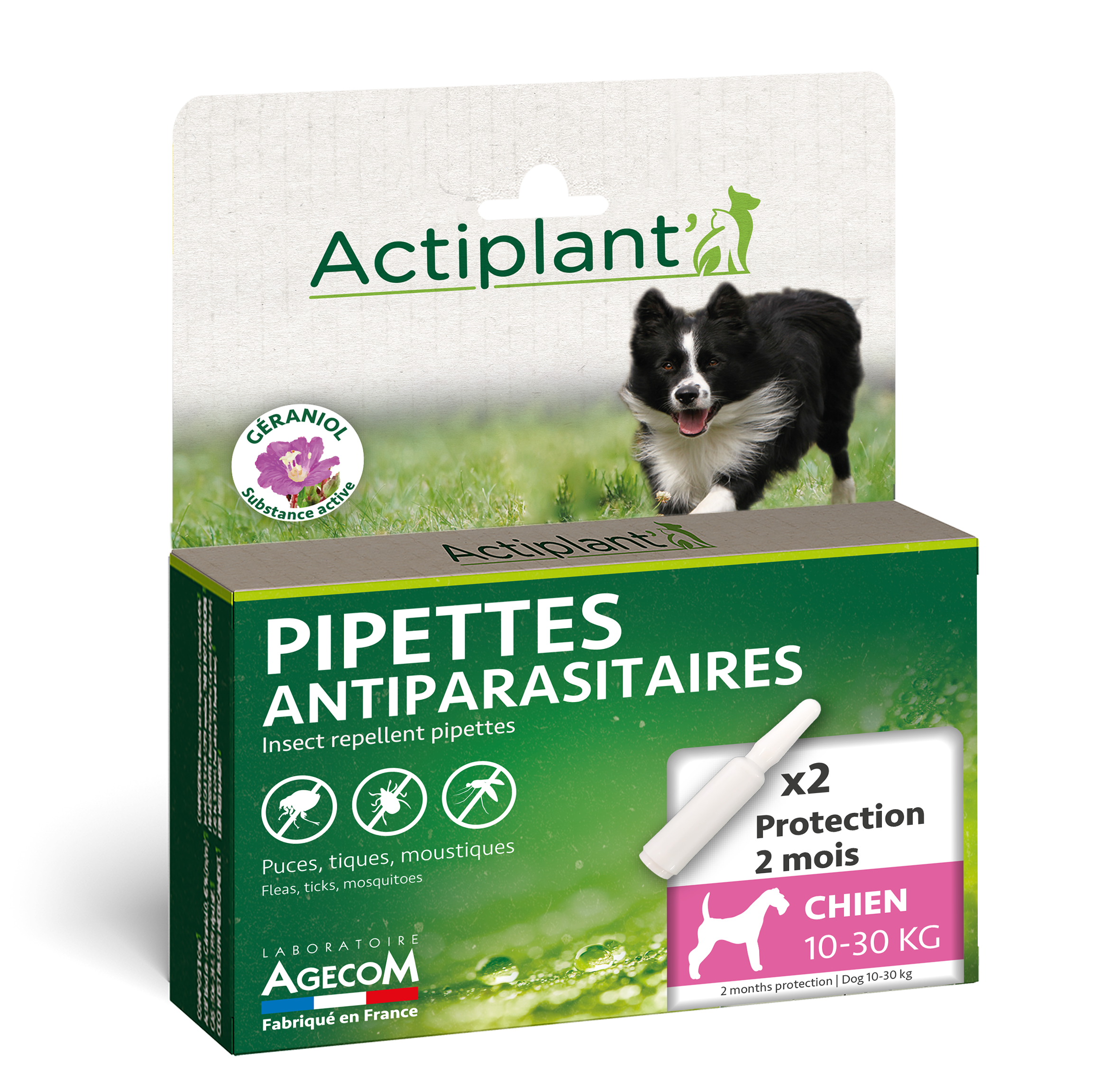 Les chiens de taille moyenne (Border Collie, Épagneul, Cocker...) sont souvent des animaux d'extérieur très actifs. Pour les accompagner dans leurs aventures sans craindre les parasites, le laboratoire Agecom a conçu cette solution répulsive Fabriquée en France.