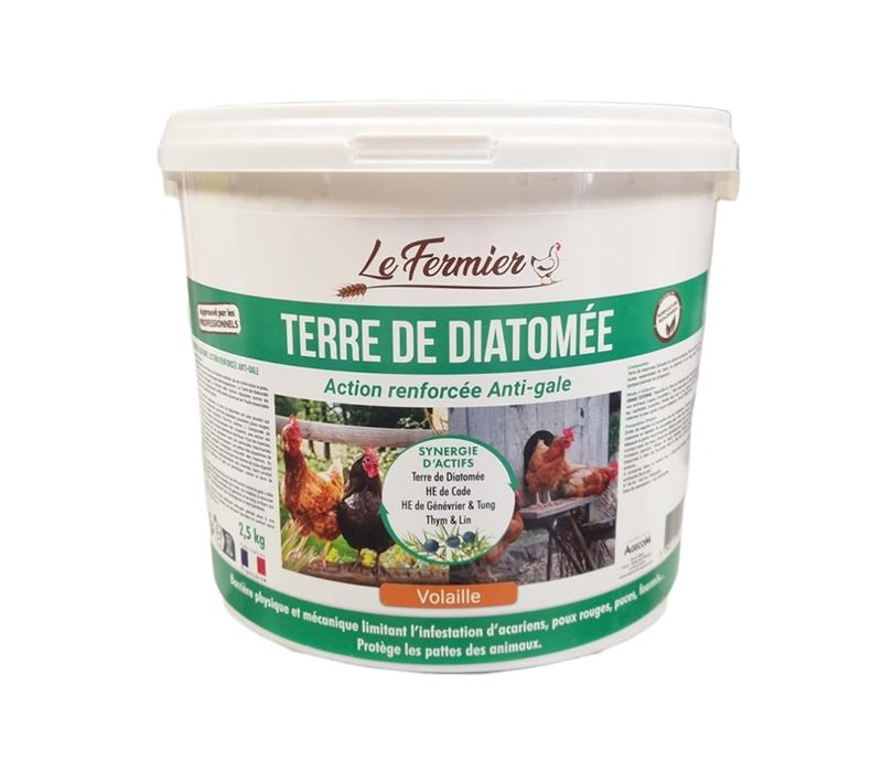 La Terre de Diatomée Anti-gale Le Fermier va au-delà d'un insecticide classique en proposant une barrière physique et mécanique enrichie. Conçue spécifiquement pour la volaille, cette poudre combine les propriétés abrasives de la diatomée à une sélection rigoureuse d'extraits végétaux pour assainir l'environnement de vos animaux et soigner leur confort cutané.