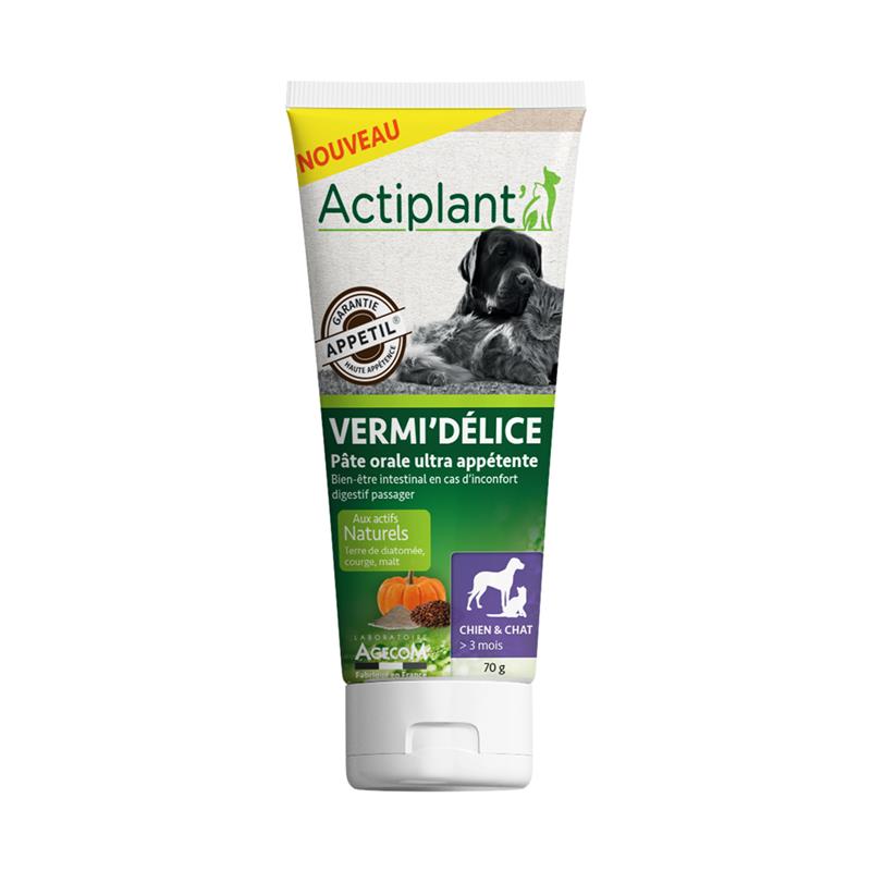 Fini la corvée des cachets ! Actiplant' Vermi'Délice est une pâte orale ultra appétente conçue pour le bien-être intestinal des chiens et chats (dès 3 mois). Formulée aux actifs naturels (Terre de diatomée, Courge, Malt), elle favorise l'expulsion des parasites tout en étant prise comme une friandise grâce à sa garantie "Appétil"