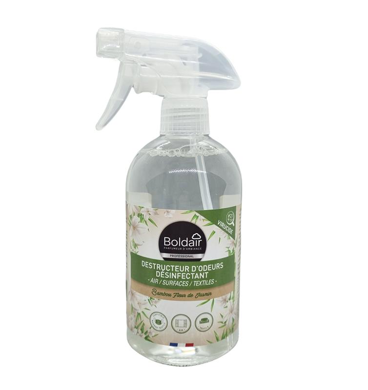 Le Spray Boldair Désinfectant au parfum Bambou Fleur de Jasmin est une solution professionnelle 3-en-1.