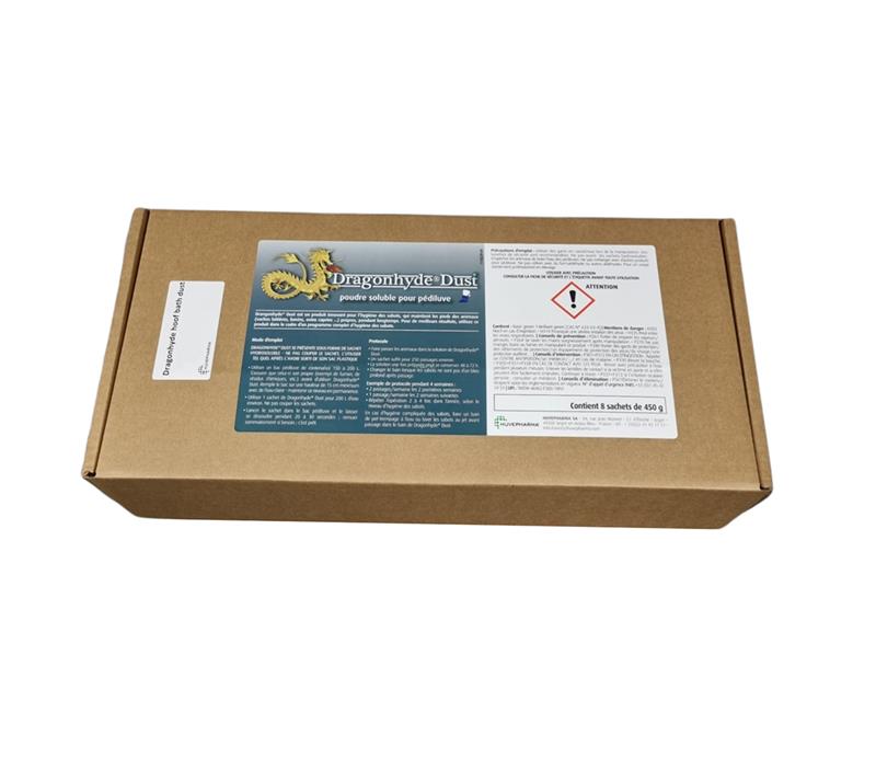 Dragonhyde® Dust est conditionné en carton de 8 sachets de 450 g. Cette présentation permet une gestion facile des stocks et une mise en place rapide du protocole de soin.