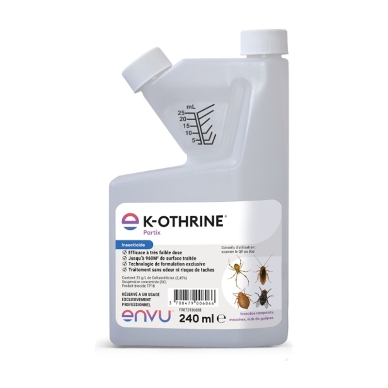 Le K-Othrine® Partix™ est un insecticide professionnel à large spectre conçu pour le traitement des surfaces intérieures et extérieures abritées. Grâce à sa technologie de formulation révolutionnaire, il offre des performances exceptionnelles sur toutes les surfaces, y compris les plus poreuses comme le béton, le bois ou l'enduit. Sa rémanence allant jusqu'à 12 semaines en fait une solution de choix pour l'éradication des punaises de lit, des blattes et des nids de guêpes.