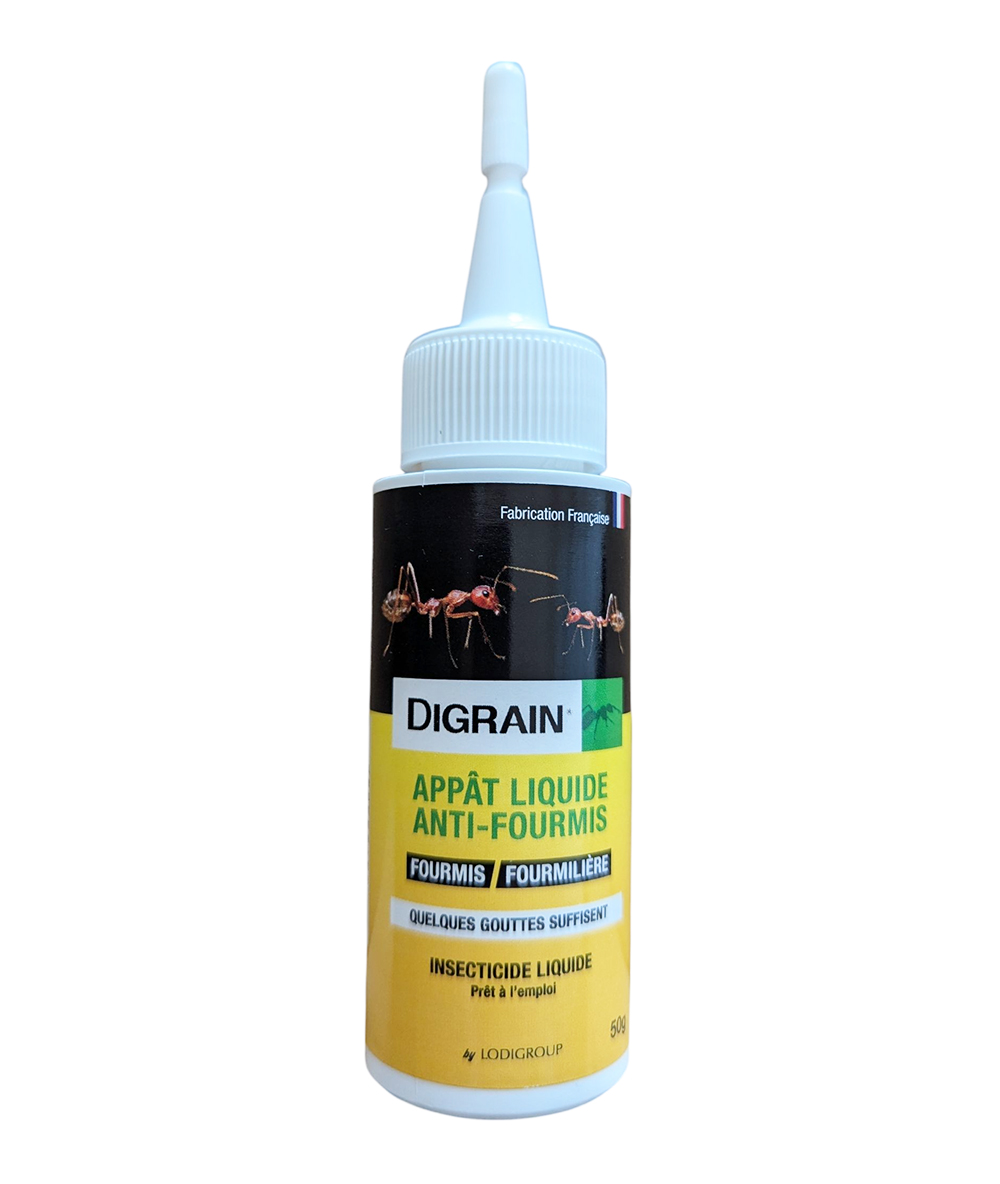 L'Anti-Fourmis Liquide DIGRAIN est un insecticide concentré redoutable pour l'éradication totale des fourmilières. Sa formule unique à base de Cacodylate de sodium (5,5%) agit par contact et ingestion avec un effet retard : les fourmis ne meurent pas instantanément, ce qui leur permet de contaminer leurs congénères au nid.