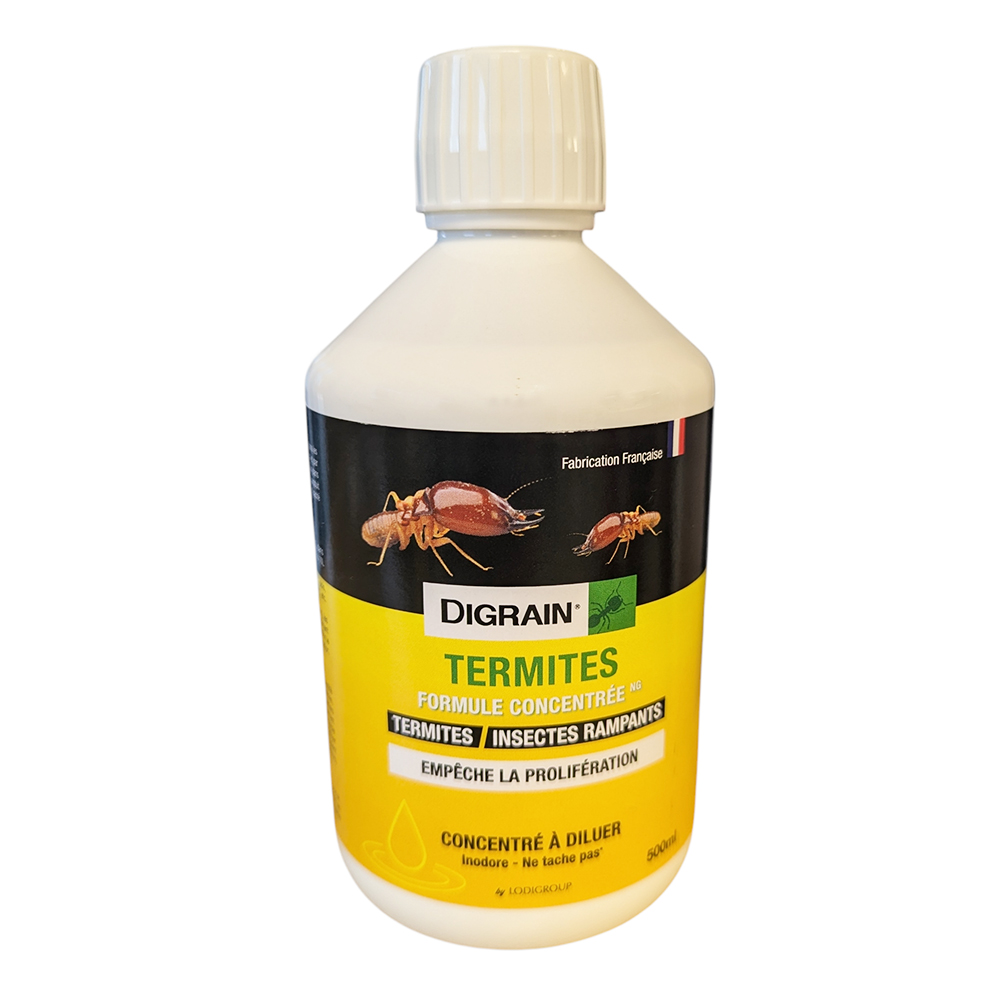 Le DIGRAIN® TERMITES FORMULE CONCENTRÉE NG est un insecticide liquide haute performance conçu pour lutter contre les termites et autres insectes rampants dans les habitations et locaux professionnels. Alliant effet choc immédiat et protection durable jusqu'à 12 semaines, cette formule concentrée agit par contact et par ingestion pour empêcher toute prolifération.