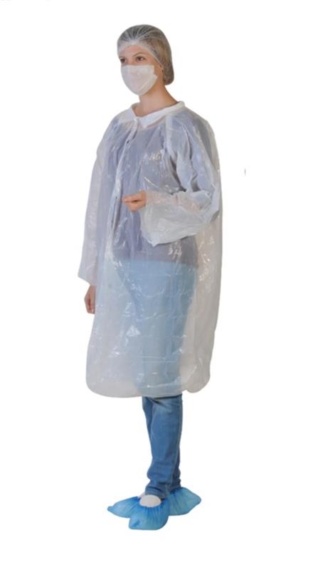 Le Corps : Une blouse en polyéthylène (PE) imperméable. Taille unique, elle est équipée d'un col classique et de 3 boutons pressions pour une fermeture rapide. Sans poche pour éviter d'y stocker des objets contaminants.