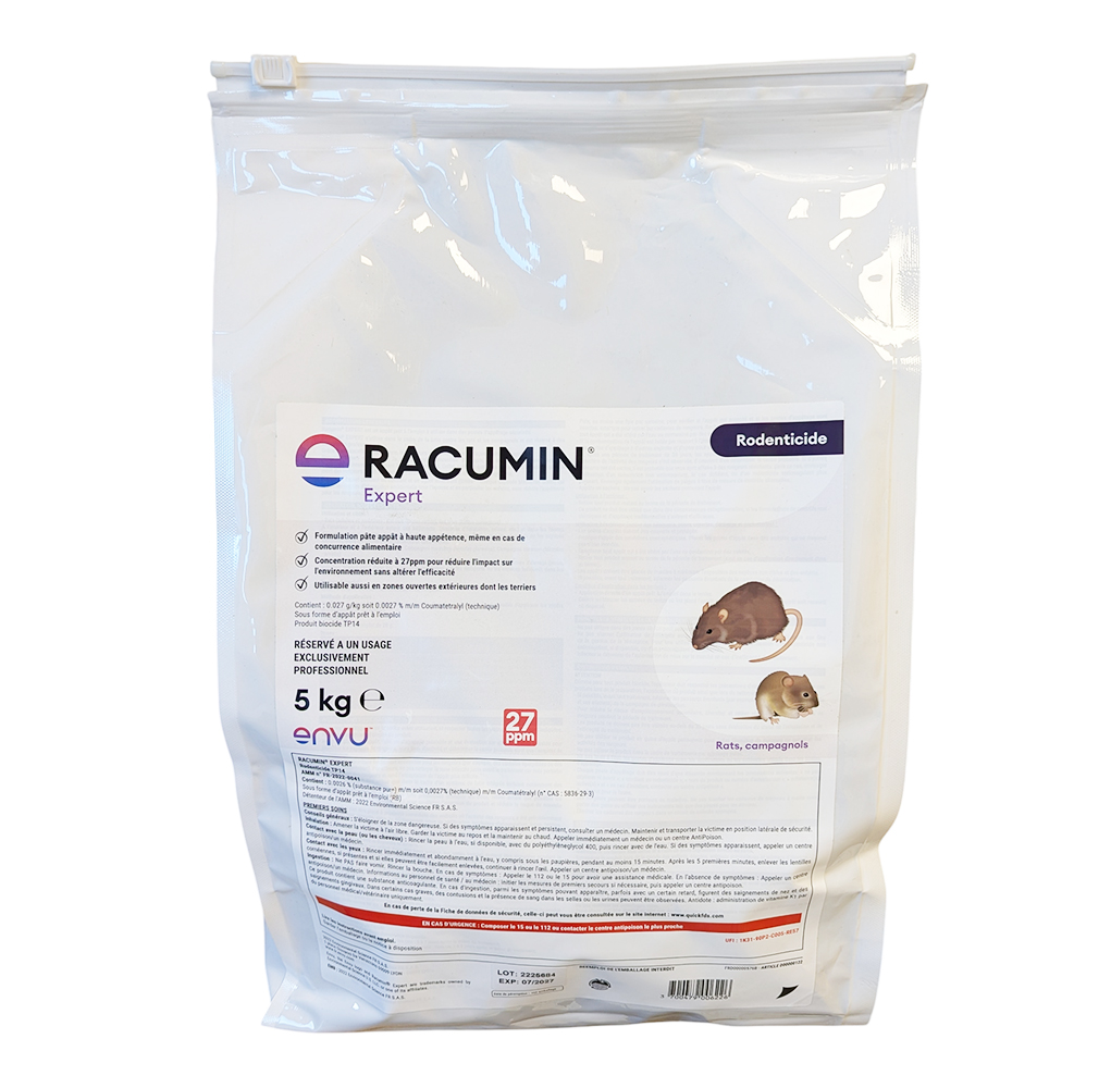 RACUMIN Expert est un appât rodenticide professionnel prêt à l'emploi sous forme de pâte fraîche, conditionné en sac de 5 kg contenant 250 sachets de 20 g. Formulé avec du Coumatétralyl, un anticoagulant de première génération, il élimine efficacement les rats, souris et campagnols. Son action retardée est stratégique : elle évite toute méfiance au sein de la colonie pour un taux d'ingestion maximal.