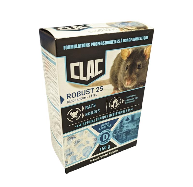 Le Clac ROBUST 25 est un rodenticide prêt à l'emploi sous forme de pâtes moelleuses, spécialement conçu pour éradiquer les rats et les souris. Formulé à base de Brodifacoum (0,0025%), il est particulièrement efficace contre les espèces résistantes grâce à sa richesse en graisses qui favorise une assimilation rapide du poison. Pratique et polyvalent, cet appât convient parfaitement pour le traitement de l'habitation et des zones sèches ou légèrement humides.
