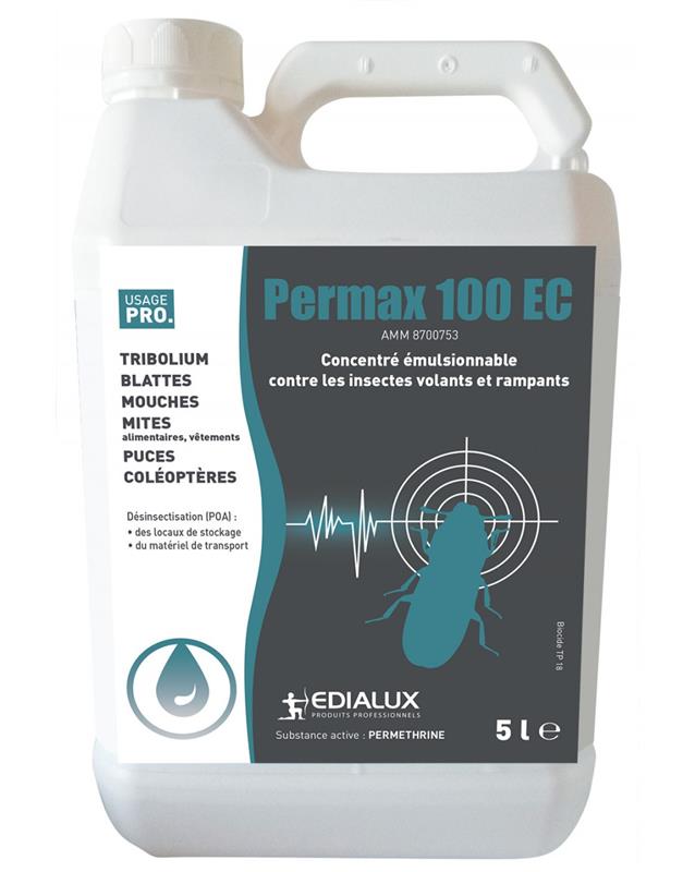 Le PERMAX 100 EC est un insecticide émulsionnable (EC) haute performance destiné à la destruction radicale d'une large variété d'insectes rampants et volants. Formulé pour un usage strictement professionnel (TP 18), il assure une protection de longue durée dans les environnements industriels et résidentiels. Sa composition à base de perméthrine garantit une efficacité redoutable sur plusieurs semaines.