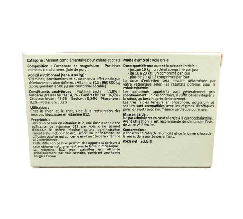 Additif : Vitamine B12 – 960 000 µg/kg (soit 500 µg par comprimé)