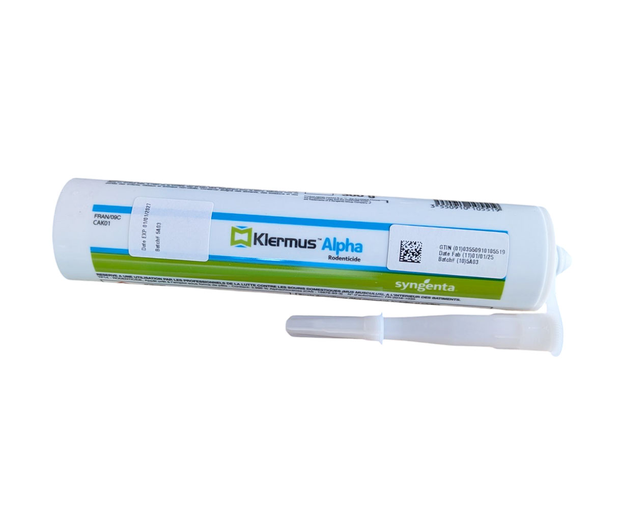 Klermus Alpha se distingue par sa rapidité d'exécution. Contrairement aux anticoagulants classiques qui agissent sur plusieurs jours, l'alphachloralose provoque une somnolence puis une mort rapide des rongeurs. Cette cartouche de 300 g est particulièrement appréciée des professionnels pour sa facilité d'utilisation et son efficacité redoutable sur les infestations isolées ou massives.