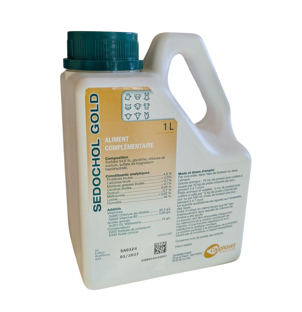 SEDOCHOL® GOLD est une solution buvable haute performance de 1 litre, spécifiquement formulée par le laboratoire Coophavet pour soutenir la fonction hépatique des animaux d'élevage et de compagnie. Ce partenaire de confiance aide à protéger et régénérer les cellules du foie, essentielles pour une digestion optimale, une détoxification efficace et une vitalité accrue de vos bêtes.