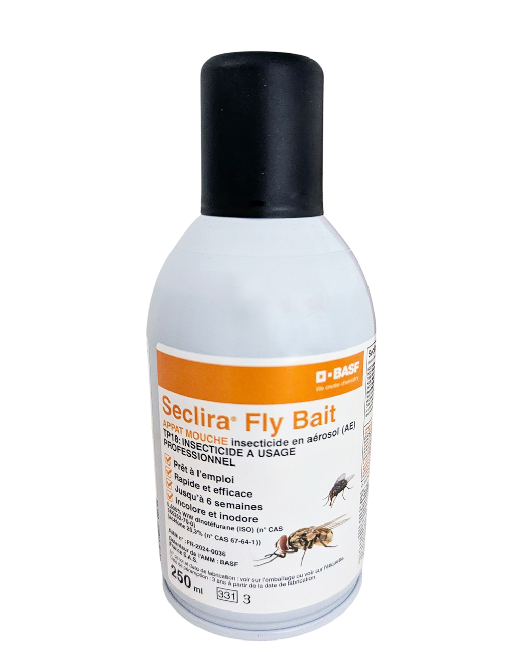 Seclira® Fly Bait est une innovation majeure dans la lutte contre les insectes nuisibles : il s'agit du tout premier appât anti-mouches pulvérisable prêt à l'emploi. Cet aérosol de 250 ml contient un attractif puissant qui incite les mouches à se nourrir directement sur les surfaces traitées. Formulé par BASF, cet insecticide incolore et inodore garantit une protection rapide et efficace pour une durée allant jusqu'à 6 semaines.