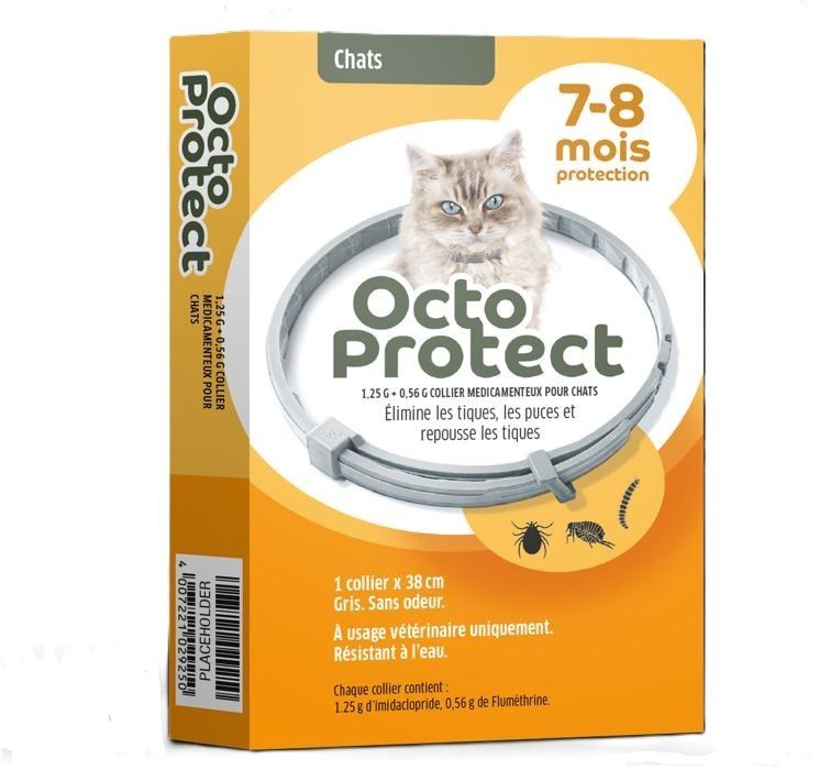 Collier antiparasitaire OctoProtect pour chat de 38 cm, assure 8 mois de protection contre les tiques, les puces et les larves de puces