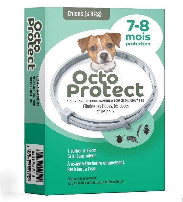 Collier antiparasitaire OctoProtect, spécialement conçu pour les chiens pesant jusqu’à 8 kg. Ce collier antiparasitaire agit contre les tiques, puces et poux.