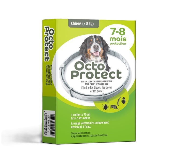 Collier antiparasitaire OctoProtect, spécialement conçu pour les grands chiens de plus de 8 kg. Ce collier antiparasitaire agit contre les tiques, puces et poux.