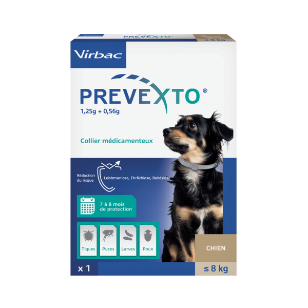 Le collier PREVEXTO® pour petit chien est une solution antiparasitaire innovante conçue par les laboratoires Virbac pour les chiens pesant jusqu'à 8 kg. Ce collier de 38 cm offre une protection continue et durable pendant 7 à 8 mois contre les tiques, les puces et les poux broyeurs. Très pratique, il constitue une alternative efficace aux traitements mensuels tout en restant actif même après des baignades.