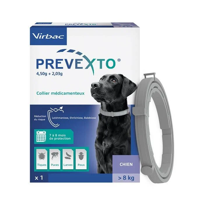 Le Collier Prevexto Grand Chien est une solution antiparasitaire médicamenteuse développée par les laboratoires Virbac. Spécialement conçu pour les chiens de plus de 8 kg, il offre une protection continue et longue durée (jusqu'à 8 mois) contre les tiques, les puces et les poux, réduisant ainsi les risques de maladies transmises par ces parasites.