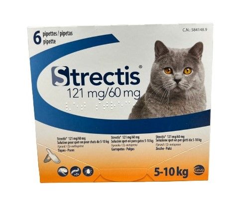 Strectis 121 mg/60 mg est un antiparasitaire spot-on complet pour chats de 5 à 10 kg. Il élimine et prévient les infestations de puces, tiques et vers intestinaux en une seule application.