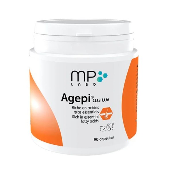 Agepi Omega 3 & 6 est un complément alimentaire vétérinaire du laboratoire MP Labo, conditionné en boîte économique de 90 capsules. Sa formule équilibrée associe les Oméga 3 aux Oméga 6, créant une synergie parfaite pour nourrir la peau, renforcer la barrière cutanée et redonner éclat et brillance au pelage des chiens et des chats.