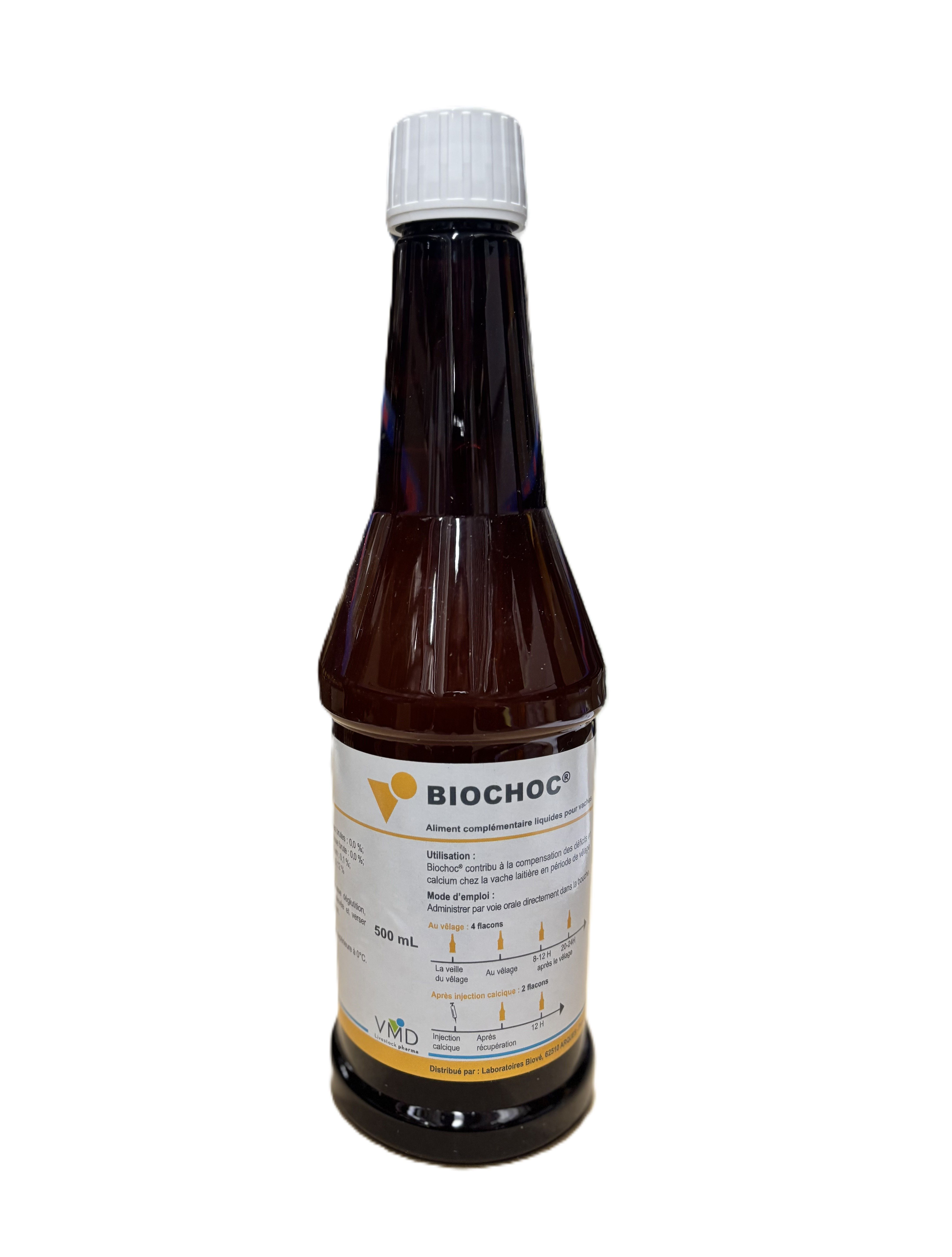 BIOCHOC® (500 ml) est une solution buvable spécialement conçue pour réduire et compenser le déficit en calcium chez la vache laitière au moment critique du vêlage. Formulé par les Laboratoires Biové (Inovet/VMD), ce complément alimentaire liquide assure une prévention efficace contre l'hypocalcémie post-vêlage et soutient la récupération métabolique de l'animal.