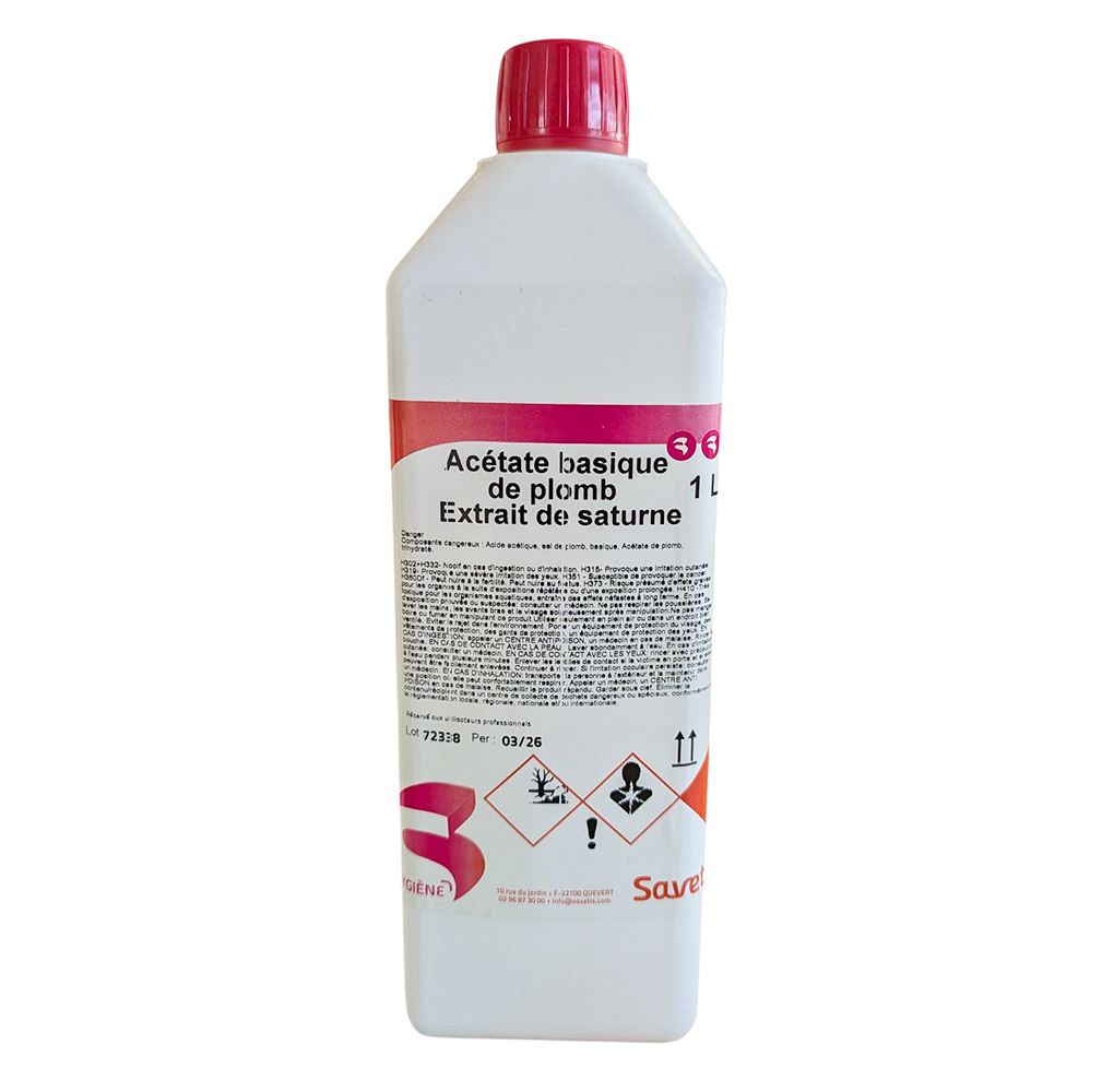 Le Sous-acétate de plomb 1 L (Savetis), historiquement appelé Extrait de Saturne, est une solution liquide à usage vétérinaire destinée aux soins des chevaux. Ce produit de référence est principalement utilisé pour la préparation de l'eau blanche, un remède traditionnel réputé pour ses propriétés apaisantes sur la peau des équidés.
