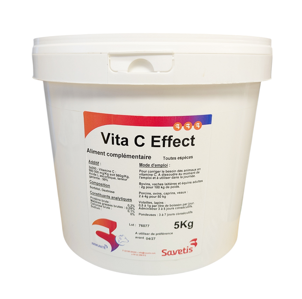 La Vitamine C Effect Savetis 5 kg est un complément alimentaire riche en vitamine C, conçu pour stimuler les défenses immunitaires, réduire le stress oxydatif et soutenir les animaux d’élevage lors des périodes critiques.