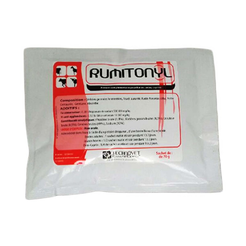 Le Rumitonyl boîte de 100 sachets de 70 g est formulé pour stimuler la flore ruminale et favoriser la reprise de la rumination chez les animaux d’élevage.