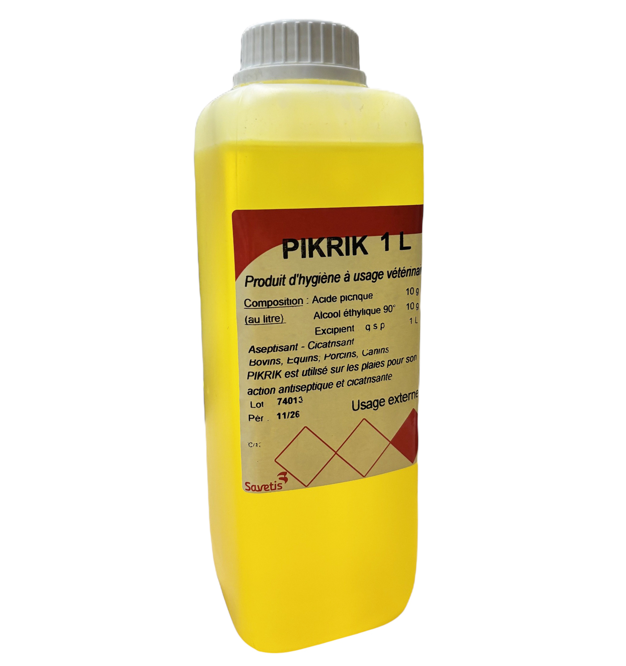 La solution Pikrik de Savetis est un antiseptique et cicatrisant vétérinaire utilisable sur toutes les espèces animales (bovins, ovins, caprins, porcins, chevaux, volailles, animaux de compagnie).