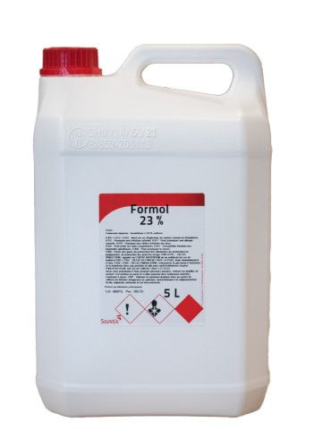Conditionné en bidon de 5 litres, le Formol 23 % est un indispensable des exploitations agricoles et structures vétérinaires.