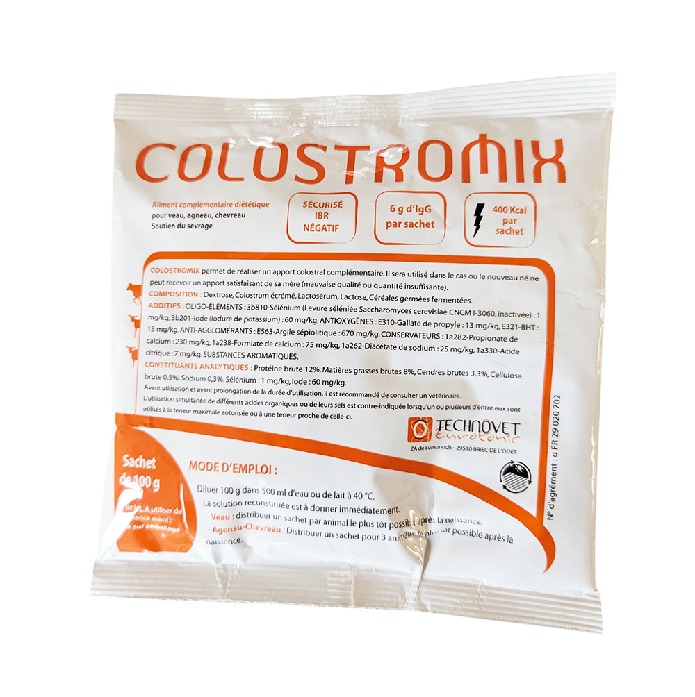 COLOSTROMIX (Technovet) est un aliment complémentaire d'allaitement riche en colostrum, spécialement formulé pour les nouveau-nés (veaux, agneaux, chevreaux). Il assure un apport immédiat en anticorps (6g d'IgG par sachet), nutriments et énergie (480 Kcal), essentiels pour stimuler l'immunité et la vitalité dès les premières heures de vie.