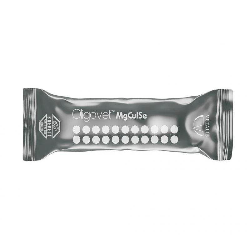 Assurez la couverture minérale de vos vaches avec Oligovet MgCuISe en format pratique de 12 bolus. Ce complément alimentaire à délitement contrôlé du laboratoire Vétalis garantit un apport quotidien en Magnésium, Cuivre, Iode et Sélénium pendant 90 jours. Il est spécialement indiqué pour prévenir les carences lors de la mise à l'herbe ou du tarissement.