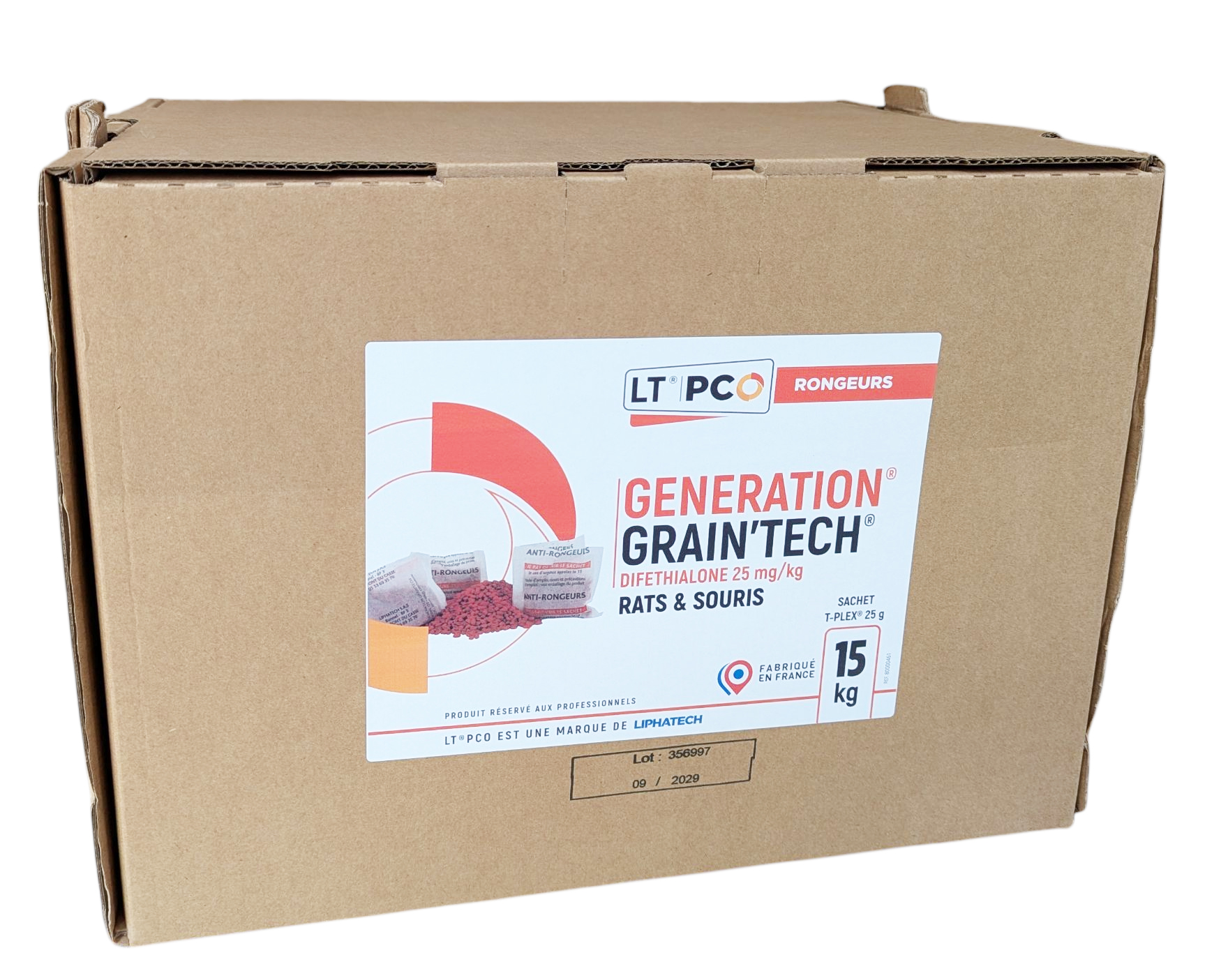 GENERATION® GRAIN'TECH® est un rodenticide de qualité supérieure conçu par Liphatech pour lutter contre les fortes infestations de rats et de souris. Grâce à l'innovation Sachet T-PLEX®, vous bénéficiez de l'attractivité exceptionnelle du grain en vrac associée à la précision du dosage individuel. Sa formulation à base de Diféthialone (0,0025%) garantit une élimination efficace, même en cas de forte compétition alimentaire.