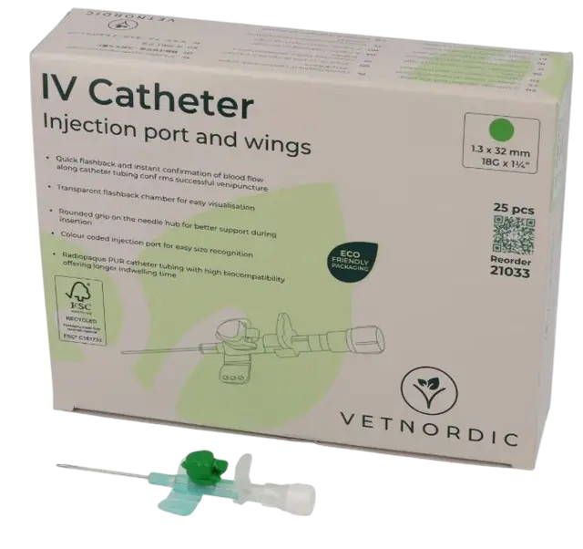 Le Cathéter IV avec port d’injection et ailes 18G Vert (25 pièces) est un dispositif médical de haute performance conçu pour les accès vasculaires périphériques nécessitant un débit de fluide important. Sa taille de 18G (Vert) est le standard privilégié pour les situations d'urgence, les transfusions et les réanimations en milieu hospitalier ou vétérinaire.